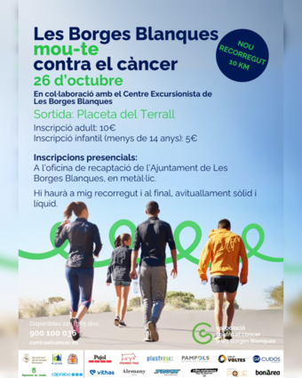 El diumenge 26 d'octubre de 2025, les Borges Blanques acollirà una nova edició de la caminada solidària "Les Borges Blanques mou-te contra el càncer", organitzada per l'Associació Contra el Càncer a les Borges Blanques amb la col·laboració del Centre Excursionista de les Borges Blanques i l'Ajuntament.
