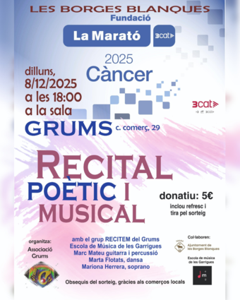 El dilluns 8 de desembre, a les 18.00 h, la sala Grums acollirà un Recital Poètic i Musical en el marc de les activitats solidàries de La Marató 2025. L'acte està organitzat per l'Associació Grums.