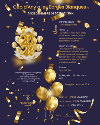 El dimecres 31 de desembre de 2025, a les 21.30 h, el Pavelló de l'Oli acollirà el tradicional Sopar i Festa de Cap d'Any. El menú inclou entrants, primer, segon a escollir, postres, pa, beguda, cafè i raïm de la sort. El preu és de 77 € per persona.