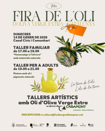 En el marc de la 29a Fira de l'Oli d'Oliva Verge Extra de Catalunya, es realitzaran dos tallers artístics a càrrec de Caramunt - Activitats i Tallers Didàctics, adreçats a diferents públics: